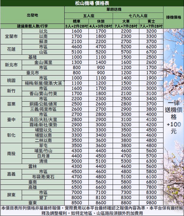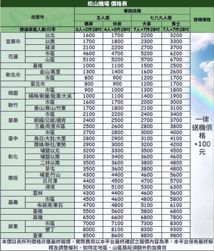 (2)部份偏遠路段/市郊區或山區路段將酌加費用$100~300。